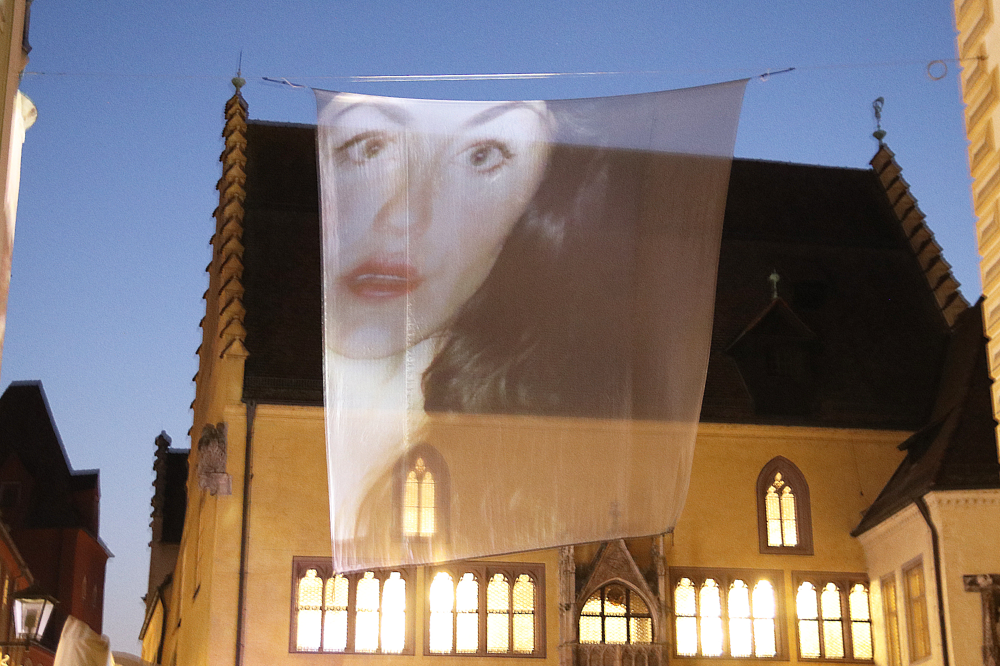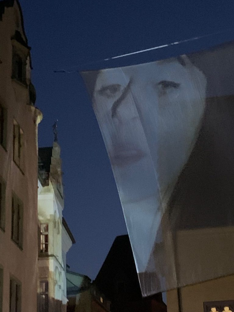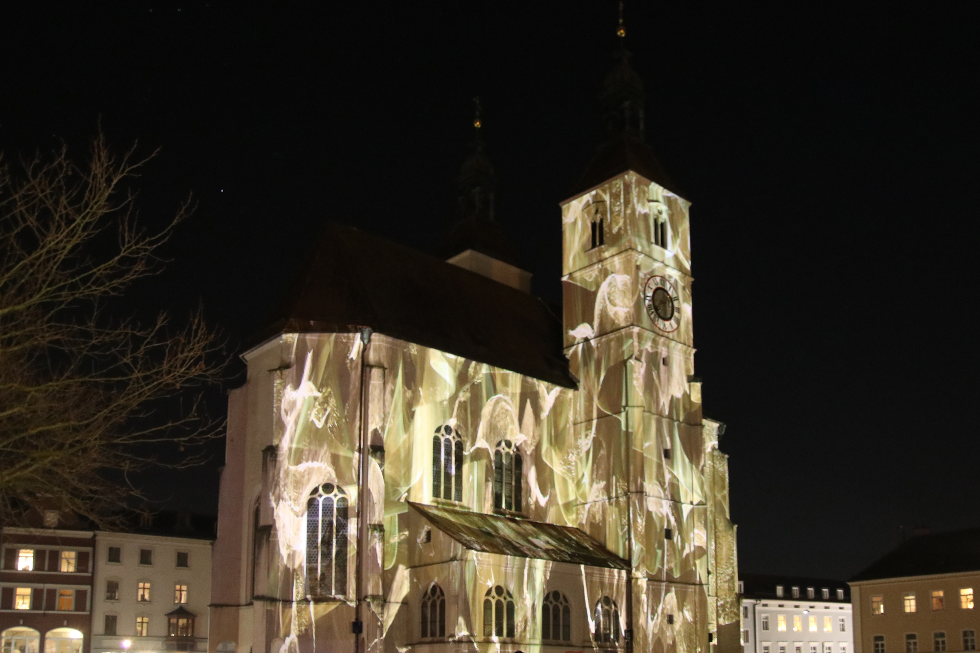 Es gibt ganz unterschiedliche Installationen: Vor dem Andreasstadel zum Beispiel sind Lichtstrahlen zu sehen, die eine Frau zeigen, deren Spiegel, dass eigene Spiegelbild einfach nicht zeigen will. Oder Ampeln erschaffen eine farbige Choreografie und Bäume verwandeln sich in Formen und Flächen.